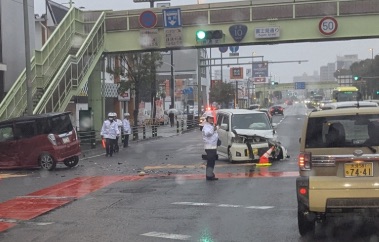 - 状況:軽自動車2台の衝突事故。交差点内で車両が大破しており、警察による交通整理が行われています。(※現場は雨天で路面が滑りやすくなっています)