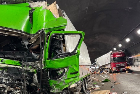 現場からの写真では、緑色のキャブの大型トラックの前部が原形をとどめないほど激しく大破しており、荷台の積荷や車両の破片がトンネル内の路面に大量に散乱している様子が確認できます。