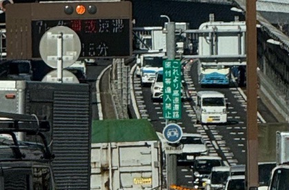 現地の画像からは、高速道路の出口付近でトラックや乗用車が数珠つなぎになり、渋滞が発生している様子が確認できます。「これより高速道路 進入禁止」の標識がある料金所・インターチェンジ付近で流れが完全に滞っているため、一般道へ降りる車両への影響も非常に大きい状態です。