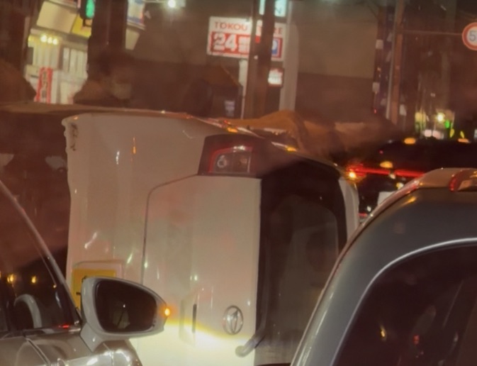 現場周辺の目撃情報によると、白い軽自動車が車道上で完全に横転している状態が確認されています。夜間の事故ということもあり、現場付近は安全確認や事故処理のため混雑しています。