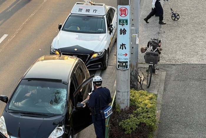 現場の目撃情報や写真によると、黒い乗用車のフロントガラスが著しく大破しており、すぐ近くには自転車が倒れているのが確認できます。歩行者または自転車との接触事故の可能性が高く、警察による現場検証および事故処理が行われています。