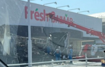 2026年3月1日朝、兵庫県姫路市香寺町香呂にあるスーパーマーケット「フレッシュバザール」の店舗前にて、搬入トラックが全焼する火事が発生しました。