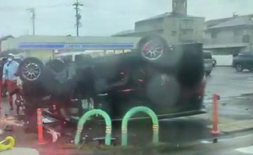 現場周辺からの目撃情報や画像によると、コンビニエンスストア(ローソン)の目の前の道路で、黒い乗用車がルーフを下にして完全に横転(裏返し)しているのが確認できます。