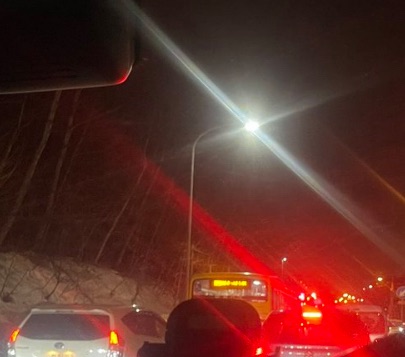 現場画像では、暗い時間帯の中で多くの車両がブレーキランプを点灯させて停車している様子が伺えます。路面状況や視界の悪化にも注意が必要です。