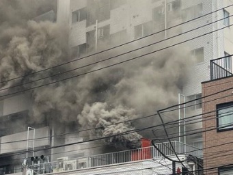 目撃者の投稿によると、建物の屋上や上層階付近から黒煙が上がっており、消防車が多数集結している状況です。