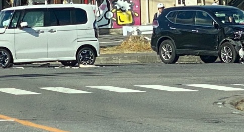 目撃者が撮影した写真によると、現場では白い乗用車と黒い乗用車が激しく衝突しており、両車両ともフロント部分が大きく破損している状態が確認できます。