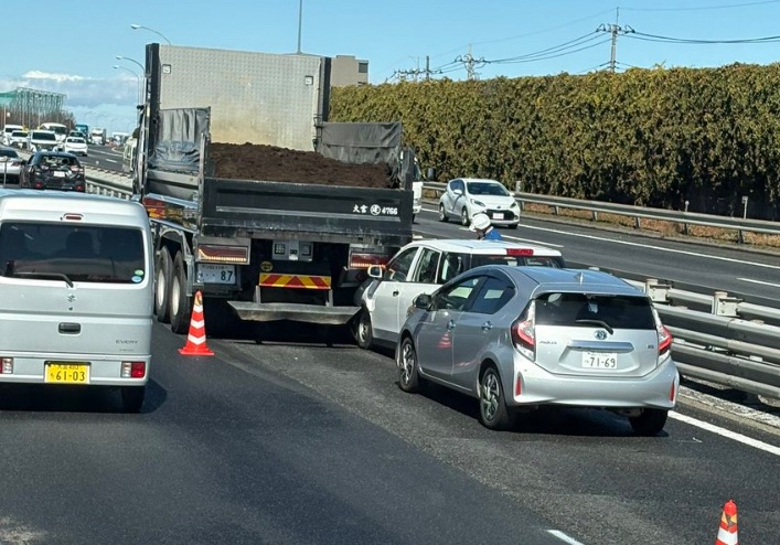 現場の様子やSNS上の目撃情報によると、走行車線上でダンプカーと複数の乗用車(白いコンパクトカーやシルバーの車両など)が絡む多重事故(玉突き事故)となっている模様です。