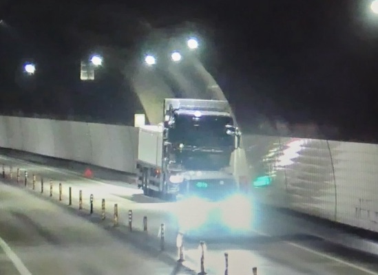 現場のトンネル内において、大型トラックのパンク修理作業が行われているためです。トンネル内という閉鎖空間での作業となるため、安全確保の観点から一時的に車線を塞いでの通行止め措置が取られています。