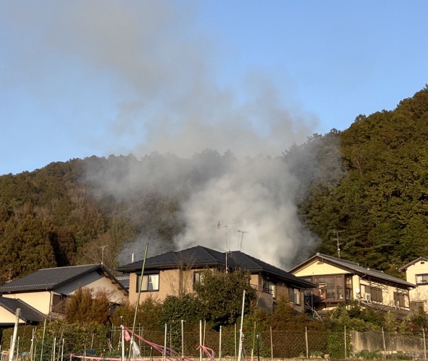 「三宅八幡で火事です。消防車がいっぱいで物々しい。山に燃え移ったら大変なことになりそう」