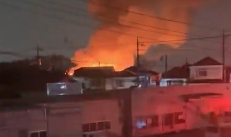 - 視覚情報: 暗闇の中でオレンジ色の炎が大きく立ち上がっており、建物が激しく燃えている様子が確認できます。