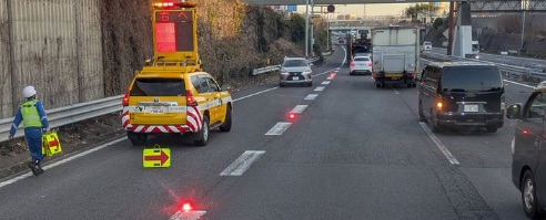 - 状況:道路パトロールカーによる車線規制および誘導が行われています。