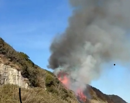 火は海岸沿いの斜面を燃え広がっており、風向きによっては煙が住宅街へ流れる可能性があります。付近にお住まいの方、または国道42号線付近を通行される方は、以下の点に注意してください。