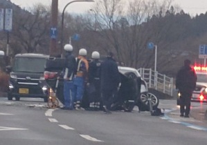 目撃者の情報によると、現場は「みとや寿司」前の道路で、乗用車とSUVが激しく衝突し、SUVが完全にひっくり返っている状態です。午前7時台の通勤ラッシュ時と重なり、現場周辺は警察官による誘導が行われています。
