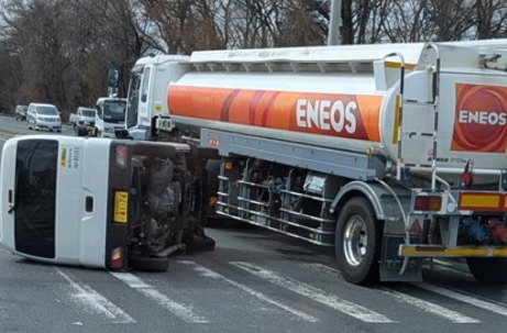 現場からの目撃情報によると、白のハイエースが道路上で完全に横転しています。付近にはENEOSのタンクローリーも停車していますが、目撃者の投稿によるとハイエースがガソリンスタンド(宇佐美)側に突っ込んでいたとの情報もあり、現在警察による実況見分が進められている模様です。