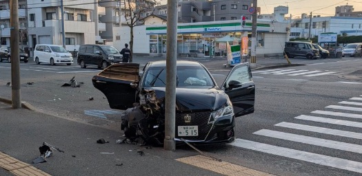 - 状況:黒のトヨタ・クラウンとトラックが衝突。クラウンはフロント部分が大破し、縁石や支柱に激突したとみられます。トラックも自走不可能な状態で道路を塞いでいます。