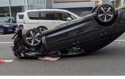 現場の目撃情報や画像によると、黒い乗用車が道路上でルーフ(屋根)を下にして完全にひっくり返っている、非常に衝撃的な状況です。