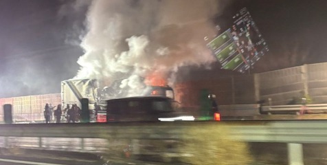 目撃情報によると、走行中のトラックの荷台部分から出火し、またたく間に車両全体に延焼した模様です。一部の投稿では「荷物のバッテリーか何かが爆発したような音がした」との報告もあり、消火活動が続けられました。