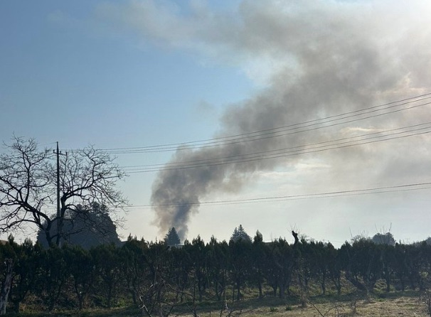 画像やSNSの情報によると、住宅街または農地付近から濃い灰色の煙が高く上がっているのが確認できます。