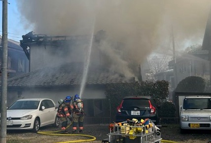 - 現場状況:大宮市営球場近くの住宅街。隣接する建物への延焼を防ぐため、消防隊による大規模な放水活動が行われています。