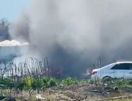 目撃者の情報によると、畑の真ん中で建物が激しく燃えており、消防隊による消火活動が行われています。