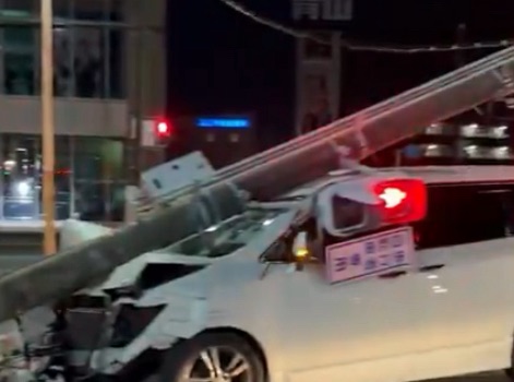 • 状況:白のミニバンが信号機の支柱に衝突。衝撃により信号機が根元から折れ、車両の屋根を押しつぶす形で倒壊しました。