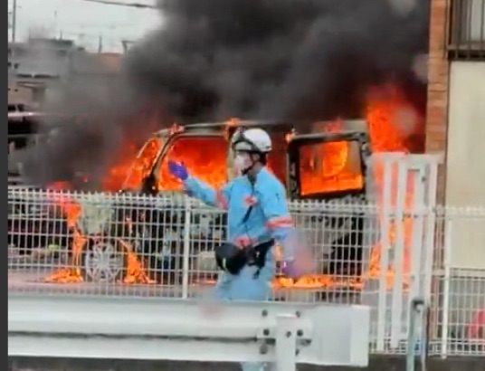 画像では、車両の全体が激しく燃えており、付近には消防隊員や警察官が駆けつけ、規制や消火活動にあたっている様子が伺えます。