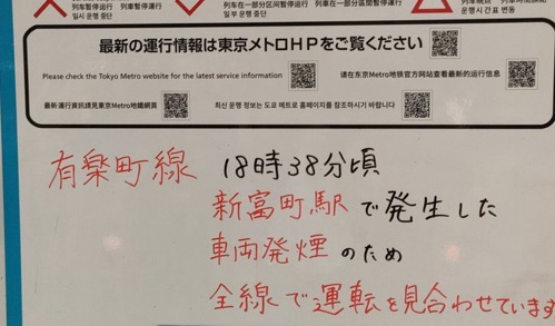 東京メトロ有楽町線、全線で運転見合わせ 新富町駅で車両空調付近から発煙 再開は19時45分頃の見込み