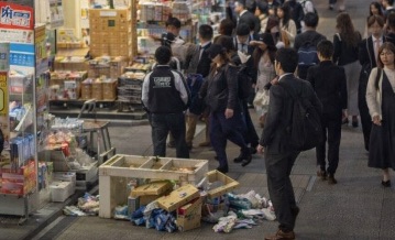 - 多数の商品が歩道に散乱し、足の踏み場もない状態