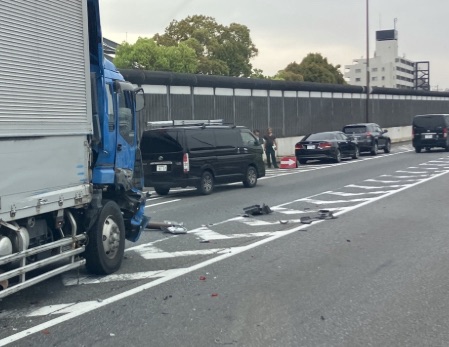 - 大型トラック(海コン)、乗用車など計3〜4台が絡む多重事故。