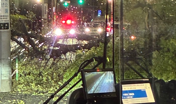 また、現場付近を走行中のバスの車窓から撮影されたと思われる画像からも、倒れた木がフロントガラスの目の前まで迫り、道路への通行を物理的に遮断している緊迫した状況が確認できます。