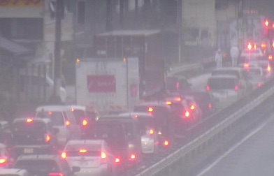 • 現場の様子:視界不良(雨・霧)の中、トラックや乗用車が滞留しており、非常に流れが悪くなっています。