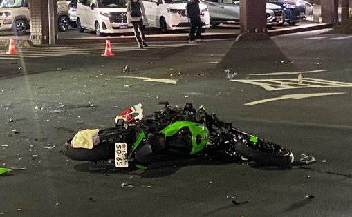 SNS上の報告によると、バイクは激しく大破しており、現場には広範囲に破片が散乱している状況です。現在、警察による現場検証が行われています。