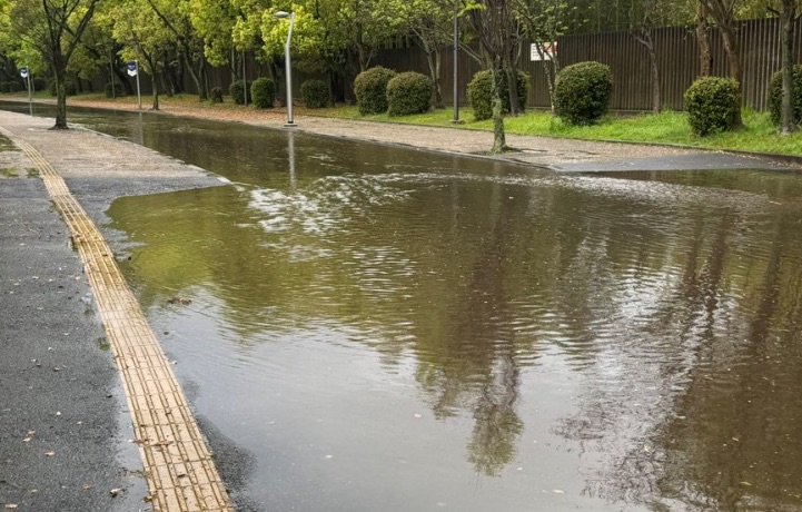 - 状況:歩道や通路が完全に水没し、一部では川のように水が流れている状態です。点字ブロックが隠れるほどの水位に達しており、歩行や自転車の通行が困難になっています。