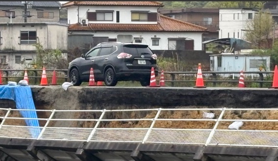 - 被害状況:路肩から道路中央付近にかけての崩落。ガードレールおよび歩道部分が完全に消失。