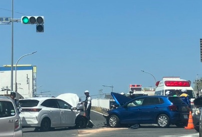 - 事故状況:乗用車(白のSUVと青のハッチバック等)による衝突事故。車両の前部が大きく損壊しており、警察および救急隊が現場に駆けつけています。