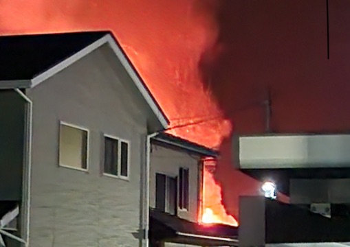 報告された画像では、住宅街の奥から激しく炎が上がり、空が赤く染まっている様子が確認できます。火の回りが早い可能性があり、延焼への警戒が必要です。